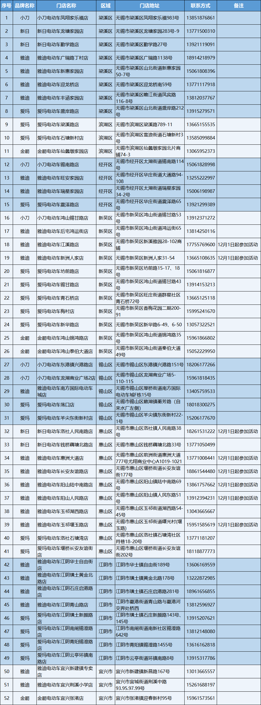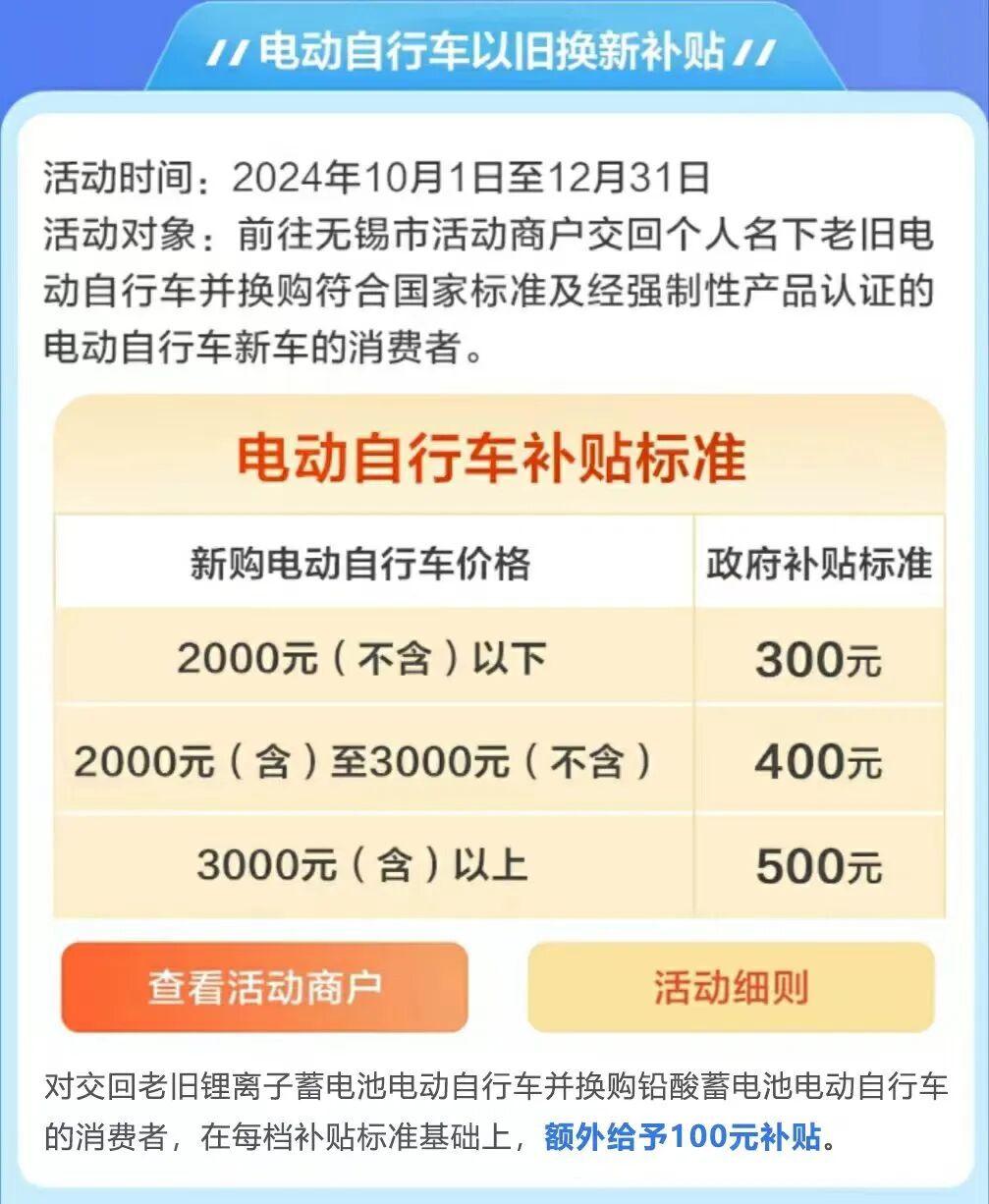 2024年10月1日,我市启动“太湖购物节”电动自行车以旧换新惠民活动,聚力“更优惠、更便利、更规范”三个维度,集聚多方资源,帮助消费者到店一站式完成收旧、换新,受到了广大市民的好评,近2个月时间已经完成旧车置换超1万辆。为进一步满足市民多样化、便利化置换需求,市商务局继续进行活动门店扩面。 符合条件的消费者“以旧换新”电动自行车可实时享受“政府补贴+旧车抵价+车企补贴+渠道补贴”多重优惠。按照活动程序,经车企报名自荐,区商务部门推荐,市商务部门复核,以旧换新活动新增活动门店52家,具体名单如下: 目前,全市累计已有254家电动自行车门店接入以旧换新活动。电动自行车以旧换新优惠政策及活动门店名单同步在“云闪付”APP“无锡消费券”专区公布,同时,各活动门店将张贴统一标识,方便购车市民。
