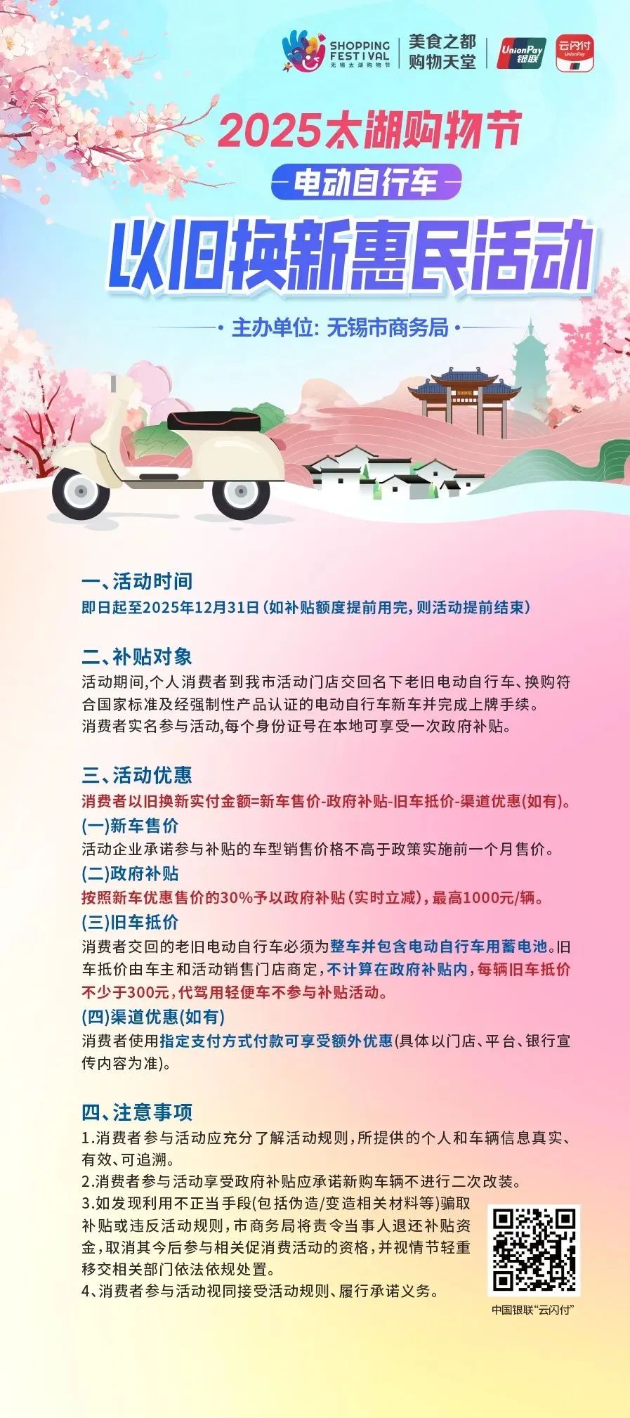 2025年1月25日,我市正式启动“太湖购物节”电动自行车以旧换新惠民活动,聚力“更优惠、更便利、更规范”三个维度,集聚多方资源,帮助消费者到店一站式完成收旧、换新,受到了广大市民的好评,为进一步满足市民多样化、便利化置换需求,市商务局持续进行活动门店扩面。 按照活动程序,经车企报名自荐,区商务部门推荐,市商务部门复核,以旧换新活动再次新增活动门店185家,具体名单如下: 目前,全市累计已有744家电动自行车门店接入以旧换新活动。电动自行车以旧换新优惠政策及活动门店名单同步在“云闪付”APP“无锡消费券”专区公布,同时,各活动门店将张贴统一标识,方便购车市民。