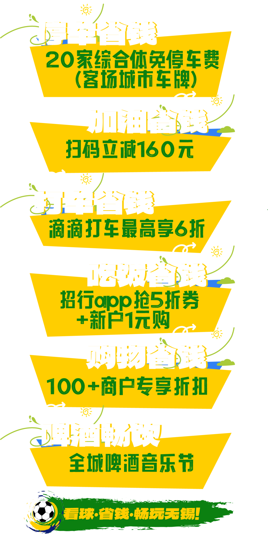 2025“苏超”战火正燃 为助力精彩赛事、激发消费活力 即日起 特推出苏超聚“惠”·欢购无锡 系列促消费活动 🛍️优惠多多,不容错过🚖 为助力苏超赛事的精彩呈现,无锡市部分重点综合体,推出客场城市车牌停车减免政策。 无论您是远道而来的球迷,还是因赛事而至的游客,都能在这场足球盛宴中,享受便捷的停车服务。 参与综合体名单如下: 星河COCO City (比赛当天所有社会车辆免费,停满为止) 宜兴八佰伴、宜兴万达 无锡八佰伴、苏宁广场、三阳百盛广场 无锡荟聚、无锡八佰伴中心 悦尚奥莱、惠山万达 滨湖万达、万象汇、融创茂 高新万达、新吴万达 百联奥特莱斯、梅里古镇 海岸城、大悦城、万象城 接下来的几天 苏超聚“惠”·欢购无锡 系列促消费活动 将会推出涵盖“吃、购、玩”等 更多优惠活动 多福利,超精彩 敬请期待~