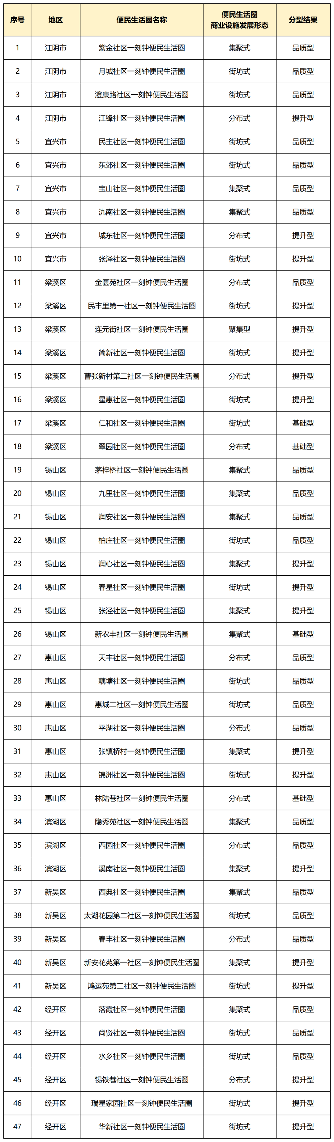 根据《商务部等12部门关于推进城市一刻钟便民生活圈建设的意见》《商务部等9部门关于加力推动城市一刻钟便民生活圈建设扩围升级的通知》《江苏省商务厅关于印发<江苏省一刻钟便民生活圈建设评价标准指引>的通知》等文件精神,结合我市工作实际,各地商务部门围绕便民生活圈试点建设成效进行了自评,在此基础上我局开展了复核,并进行了分型,最终确定47个无锡市第四批城市一刻钟便民生活圈,现将名单公示如下: 公示期为2025年12月18日至2025年12月25日,凡对上述城市一刻钟便民生活圈有相关情况反映的,请在公示期间以书面形式提出。 传真号码:81823011 来信地址:无锡市市民中心5号楼439办公室(无锡市商务局市场体系建设处)